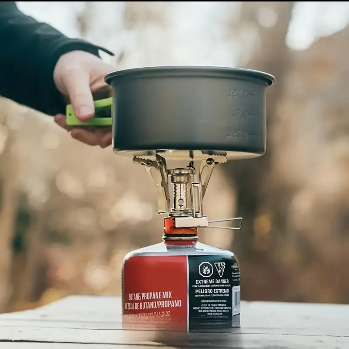 - Mini gas stove + 500 g gas bottle → boils water in under 60 seconds, works in wind and rain, tiny enough to fit in your pocket