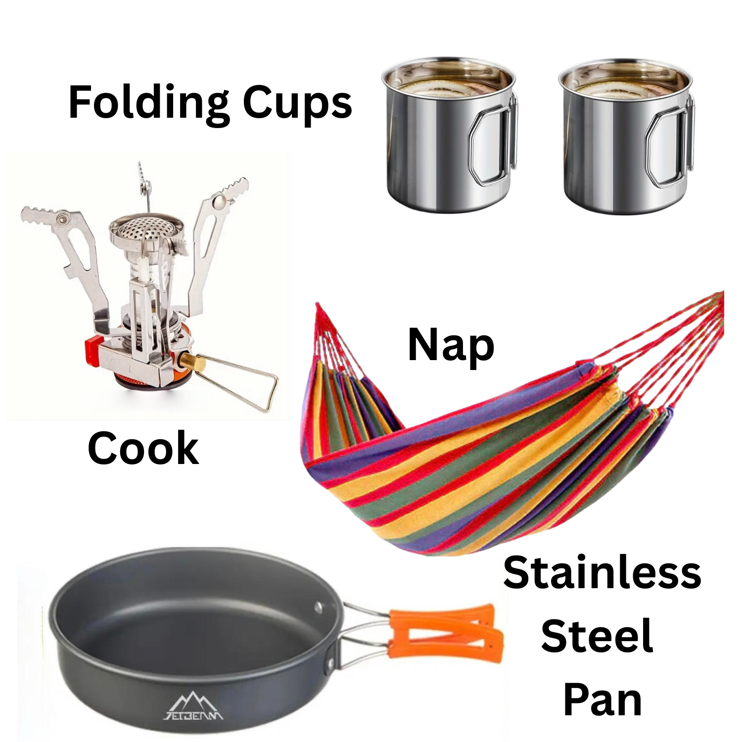 - Stainless steel folding pan → fry eggs in the morning, make toasted sandwiches at night, or heat soup in 2 minutes (non-stick, folds flat, indestructible)